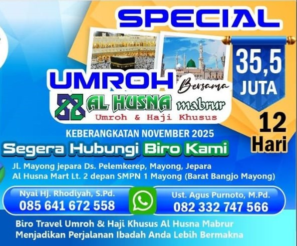 Di setiap tahunnya Al Husna Mabrur selalu memberangkatkan para jamaahnya untuk menjalankan ibadah umroh ke tanah suci. Al Husna Mabrur hadir sebagai mitra terpercaya dalam membantu jamaah Indonesia menjalankan ibadah (haji) dan umroh dengan nyaman, aman, dan sesuai syariat. Dengan pengalaman dalam menyelenggarakan perjalanan ibadah (haji) dan umroh dengan fasilitas terbaik dan didukung oleh tim profesional yang berkomitmen untuk memberikan pelayanan prima.