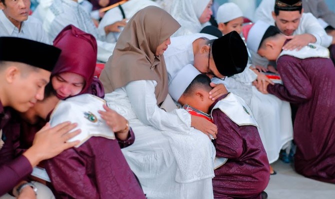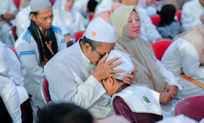Suasana penuh haru akan tercipta saat para santri mengenakan jubah wisuda, berdiri di atas panggung serta bersimpuh dipangkuan orang tua untuk mengikuti prosesi Wisuda Akbar Khotmil Qur’an sebagai peserta dihadapan para tamu undangan. Diiring dengan taushiyah oleh Pengasuh Pesantren Al Husna Internasional, air mata bangga pun tak terbendung dari para orang tua dan wali santri yang turut menyaksikan buah perjuangan putra-putri mereka. Momen pengalungan medali dan pemakaian mahkota kepada para santri yang telah menyelesaikan hafalannya dalam Wisuda Akbar Khotmil Qur’an ini menjadi simbol keberhasilan dalam mendekap kalamullah dan menjadikan cahaya hidup.